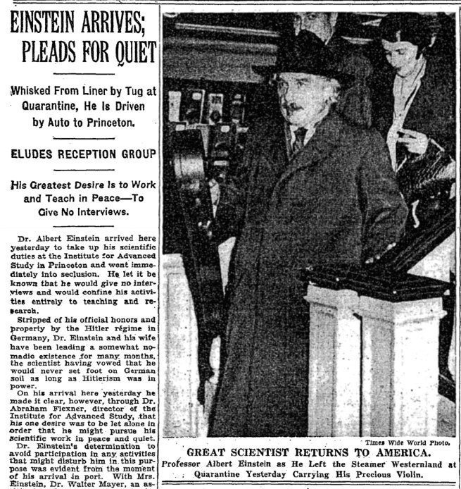 1933年10月,阿尔伯特·爱因斯坦离开欧洲入境美国时的美国报纸报道