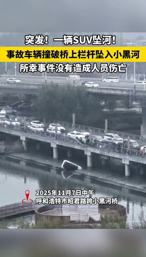 11月7日上午,内蒙古呼和浩特市昭君路小黑河大桥,一辆SUV在行驶中撞断大桥护栏坠入河中。事故引发当地网友关注。