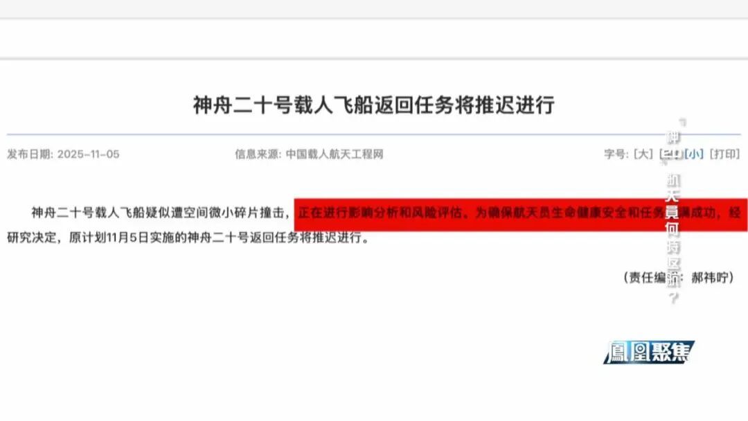 神舟二十号究竟为何延迟返航呢?寥寥数字的公告中提到了原因,疑似遭到空间微小碎片的撞击。