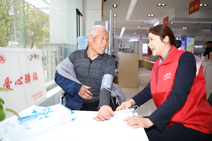 (郑州新郑人民路移动营业员为客户测量血压讲反诈技巧)