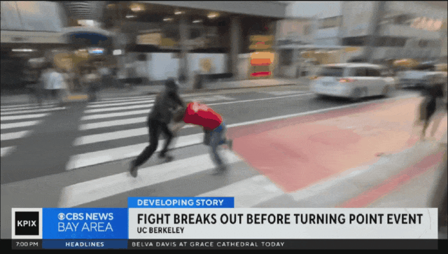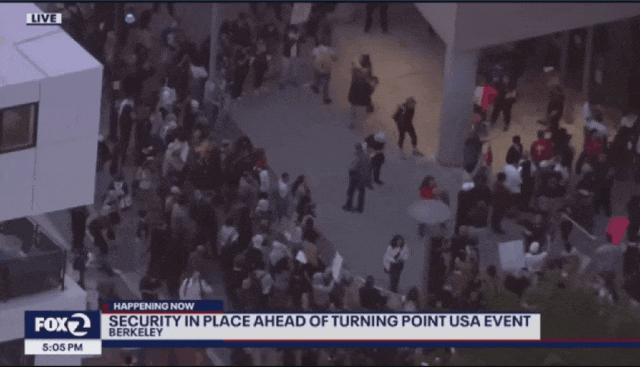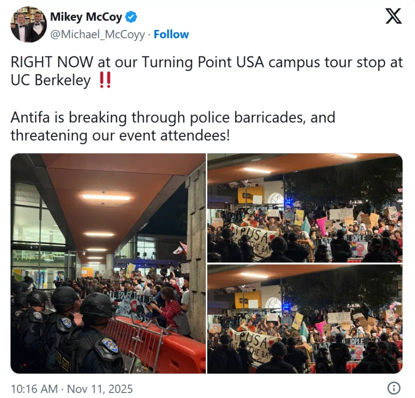“现在在我们Turning Point USA的校园巡回活动上,在UC伯克利,抗议者正在突破警察的路障,威胁我们的与会者,”TPUSA的幕僚长Mikey McCoy在X社媒平台上表示。