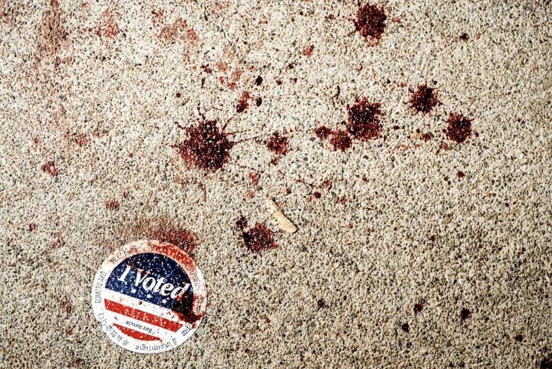 现场,一名穿着红色“Freedom” T恤的男子与另外一名男子扭打在一起,红衣男子脸上鲜血直流。