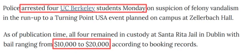UC伯克利校园警察确认已有4人被捕,其中2人是视频中出现的Turning Point支持者和抗议者,他们因参与暴力冲突被逮捕。警方还表示,这4人目前被关押在都柏林的圣丽塔监狱,保释金从10,000美元到20,000美元不等。