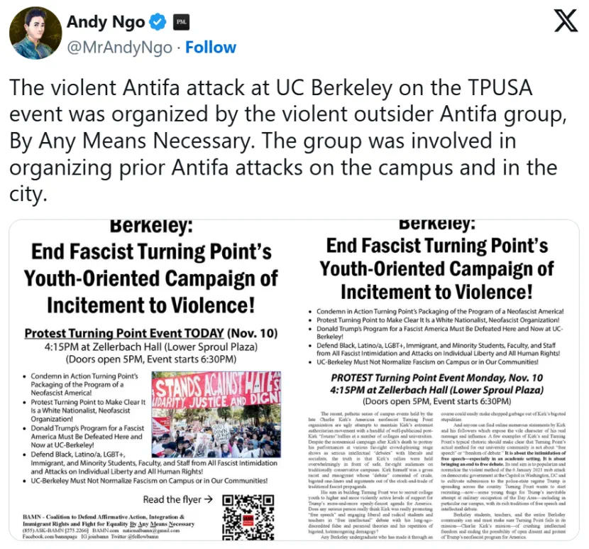 UC伯克利副校长丹·莫古洛夫(Dan Mogulof)在接受采访时也表示,学校早已知悉计划中的抗议活动。在活动举办之前,反对Turning Point USA的传单就已在校园内张贴。