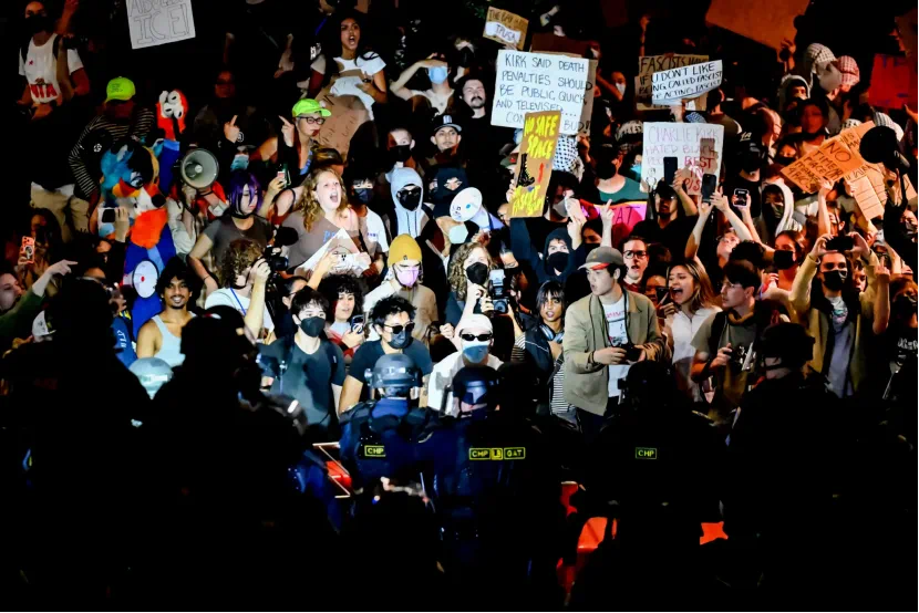 抗议者Hoku Jeffrey表示,“我们不会被吓倒,这里不是他们能为所欲为的地方。查理·柯克并不是为了促进自由言论和公开辩论而来,他是在通过恐吓和压迫让人们保持沉默。”