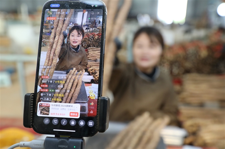 温县一家怀药专业合作社主播在网络平台销售怀山药。 温县县委宣传部供图