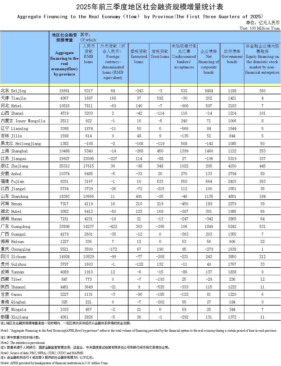 【大河财立方消息】11月12日消息,央行公布2025年前三季度地区社会融资规模增量统计表。