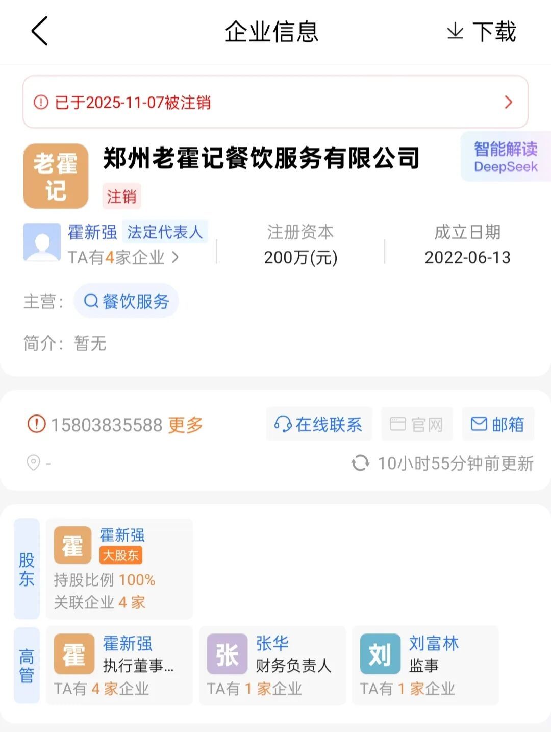 据爱企查App,郑州老霍记餐饮服务有限公司成立于2022年6月,法定代表人为霍新强,注册资本200万元人民币, 经营范围包括餐饮服务、外卖递送服务、包装服务等。该公司已于今年11月初注销。