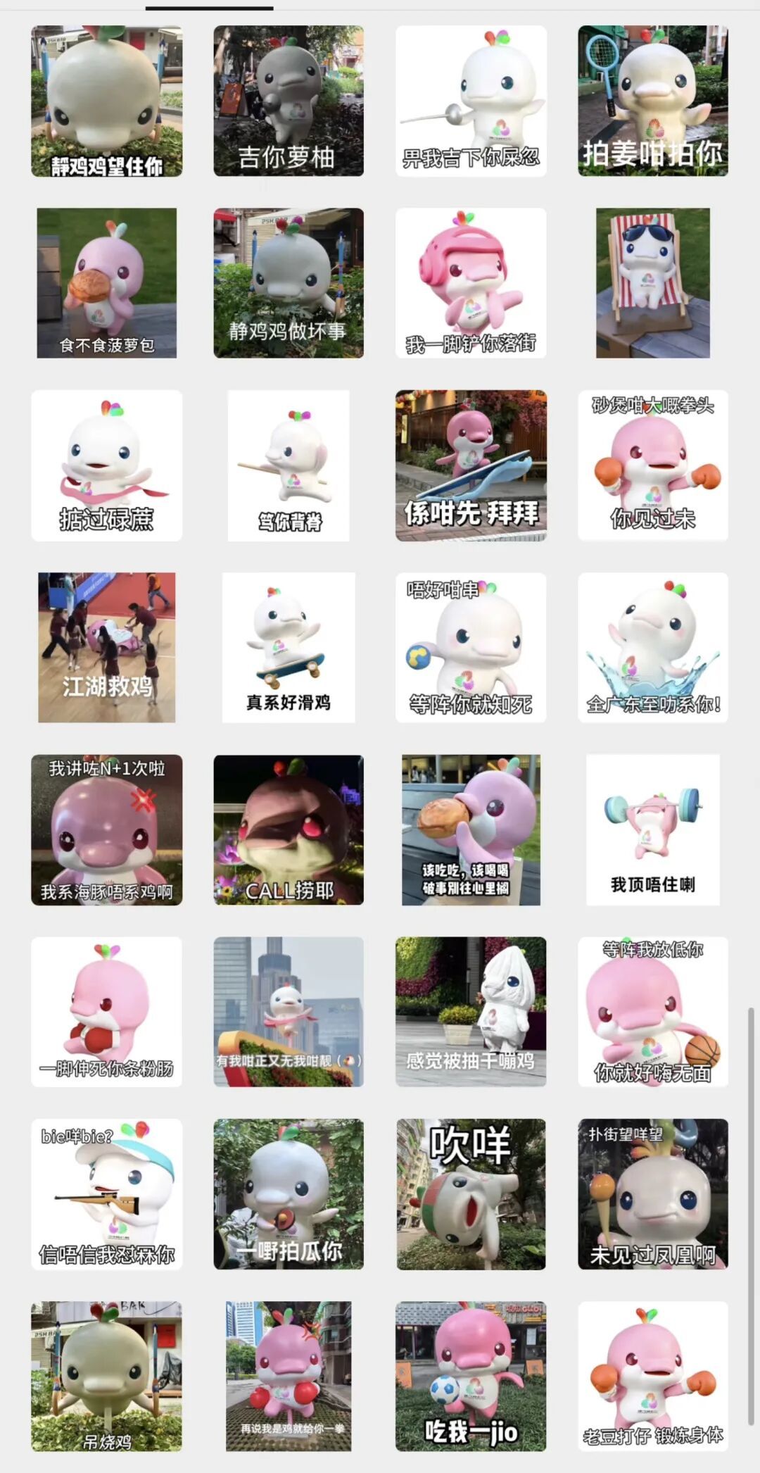 吉祥物的呆萌表情加上粤语文化的幽默buff,不但拉近了吉祥物和观众的距离,还意外地特别适配工作生活的种种场景。有网友调侃,“没有一个‘大湾鸡’表情包解决不了的社交场景——如果有,就再发一个”。