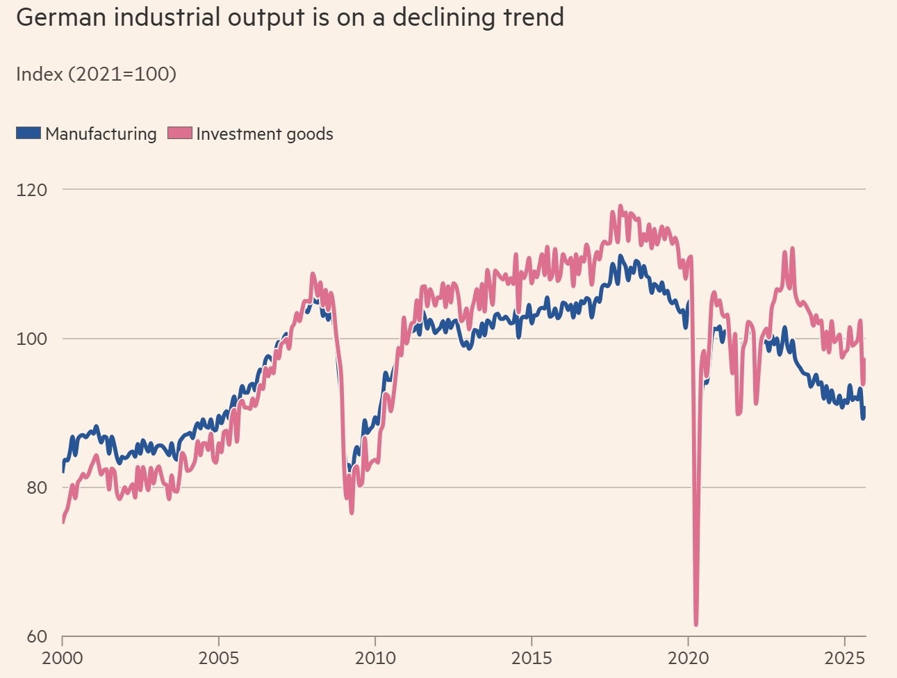 欧洲工业明珠的光彩正在黯淡。英国《金融时报》12日报道称,作为欧洲最大经济体,德国已深陷第四年停滞的困境,其引以为傲的工程和制造业核心正经历一场“自由落体式”衰退。经济学家和行业领袖纷纷警告,这场衰退并非是周期性波动,而是一场结构性危机,“不会随着下一次经济上行周期而自行消失”。