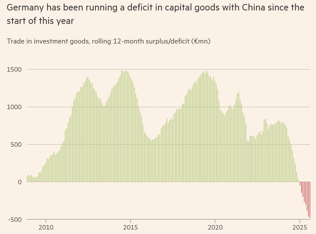 过去二十年,中国对德国工程产品和汽车看似永无止境的需求,曾推动了默克尔时代企业利润、就业和经济活动的增长。然而这一局面已彻底改变,2025年初以来,德国在资本货物领域对中国的12个月滚动贸易逆差,创下2008年有记录以来的首次。