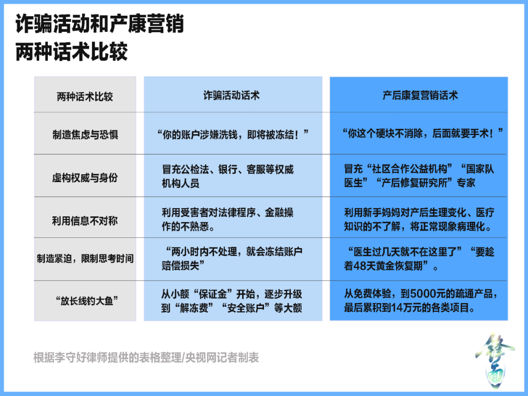 北京市隆安(广州)律师事务所李守好律师也在采访中表示:此类营销具有明显诈骗倾向,披着“科学”和“养生”的外衣,用有形的服务掩盖欺诈的本质。“提供了一次按摩、使用了一些无效、微效的甚至有害的产品,使得其行为在界定上更为模糊,容易被辩解为‘服务质量纠纷’或‘效果认知差异’,而非纯粹的诈骗。”