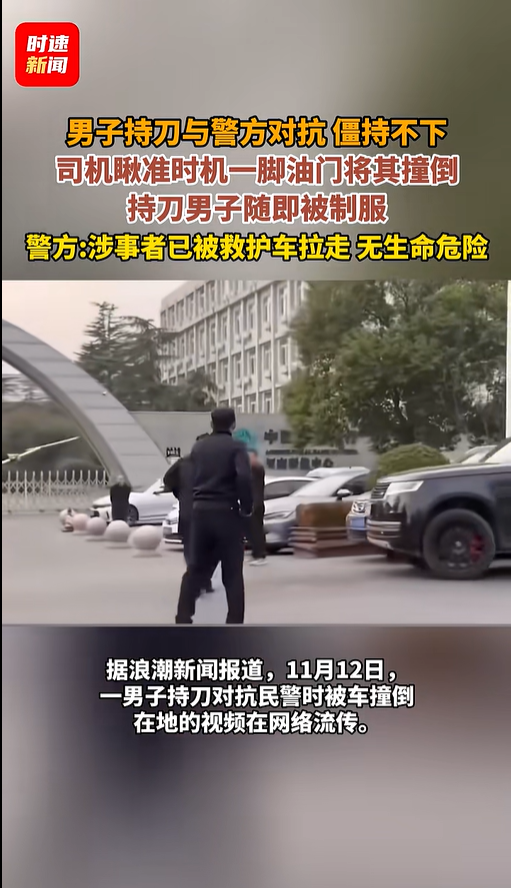 据三湘都市报,11月12日,河南郑州农业银行研修中心门口,一名黑衣男子持一把30厘米长刀与警方对峙,面对警方喊话,男子情绪激动,多次拿刀砍向警察。