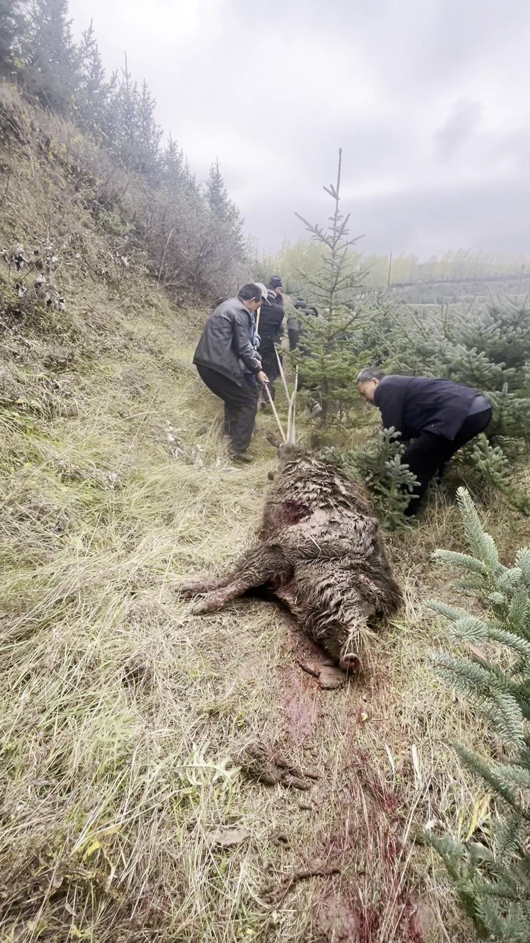 护农队成员蔡先生介绍,11日上午,护农队3名队员和当地村民一起,7人合力,才将这只野猪拖下山,村民预估野猪超过400斤重。队长邓先生告诉极目新闻记者,该护农队共有8名队员,包括无人机飞手、机油手、司机等,还有30多条成年猎犬。