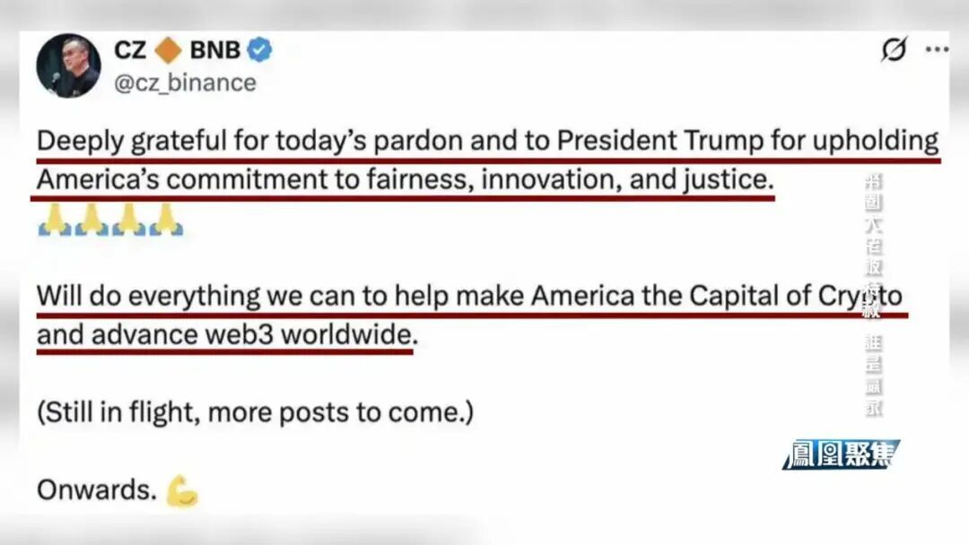 被赦免的赵长鹏也在第一时间对特朗普的特赦表示感谢,并发文称:“深深感谢今天的赦免决定,以及特朗普总统对美国公平、创新和正义承诺的维护,我们将竭尽全力帮助美国成为加密货币之都。”