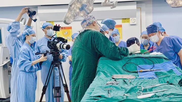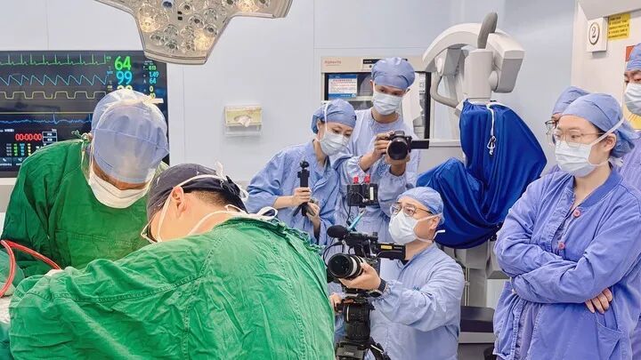 摄制团队正在记录四川大学华西医院首例半侵入式脑机接口手术。