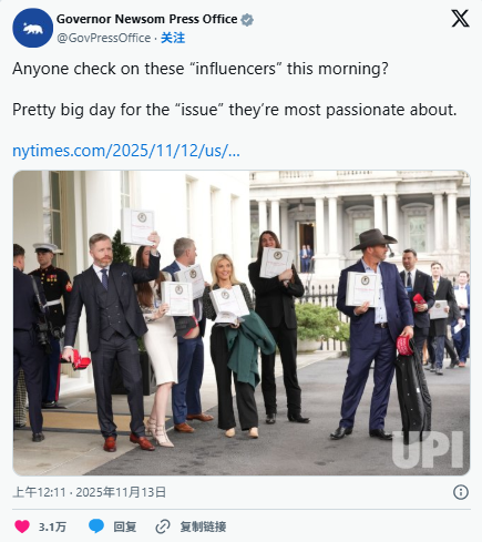 在第三篇帖子中,纽森抨击了特朗普关于他并不认识爱泼斯坦的说法,同时驳斥了司法部针对加州第50号提案(加州选民在11月4日投票通过的选区重划方案)提起的诉讼。