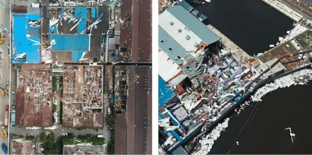 刚被龙卷风扫过的盛泽市区一片混乱,破坏带长达3公里。俯瞰画面中,房屋墙体断裂,屋顶被掀起,裸露出残缺不全的钢筋结构,厂房铁皮遭遇“肢解”,白色碎屑飘落在湖面上,有的工厂直接被夷为平地,变成一堆砖块。