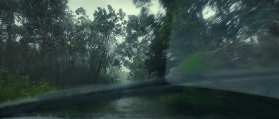 也许危险总与机遇并生,陷车的位置,刚好能让苏镝坷拍到整排树的摇曳,树林挡住雨水,让他获得持续拍摄机会,也更方便录音。