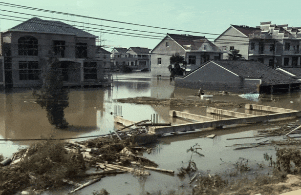 他去拍摄时,一些农民没撤走,还住在村子里,有人听说他要拍纪录片,主动划小船带他们去周边取景。航拍画面里,整个村子被洪水淹没,一栋栋白色的楼房变成汪洋中一个个孤点,一些平房只露出屋顶,村民必须划着木筏活动。