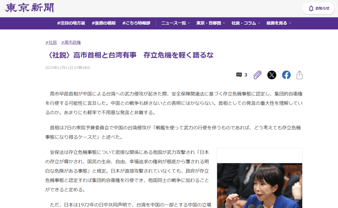 日本《东京新闻》发表社论指出,高市的言论违背了《中日联合声明》,这番鲁莽且轻率的言论无异于公开表示,她将不惜同中国开战。身为首相,此举是不能被接受的。