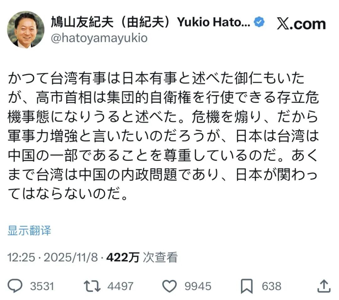 日本前首相鸠山由纪夫也发文批评她是在煽动危机、为扩军找借口。