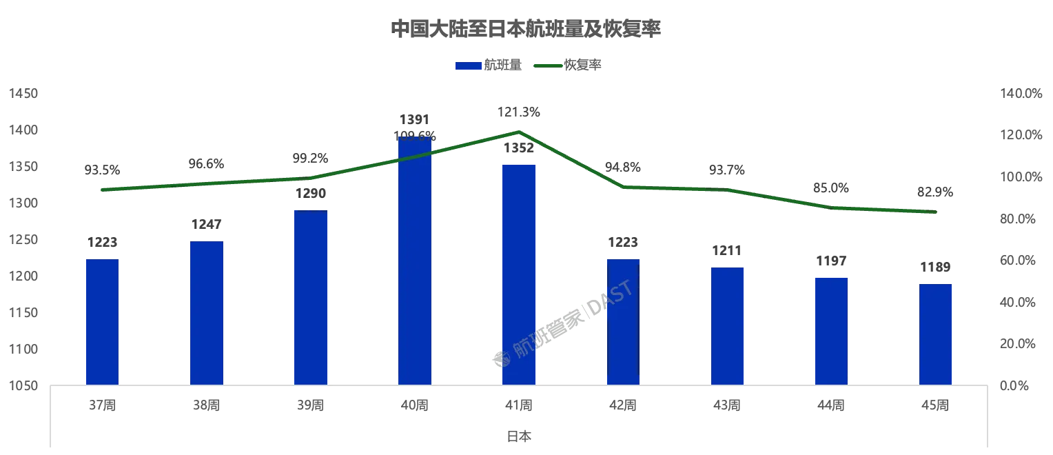 受民航换季及市场因素影响,中国大陆-日本周度航班量已大幅下滑,据航班管家数据,第45周(11.03-11.09)周航班量1189班次,恢复率(较2019年同期)为82.9%,环比第40周下降14.5%。