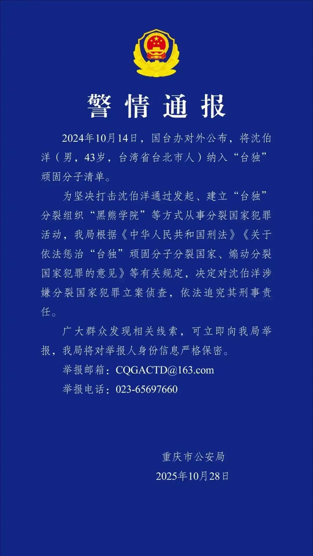 今年10月28日,重庆市公安局发布警情通报,决定对沈伯洋涉嫌分裂国家犯罪立案侦查,依法追究其刑事责任。