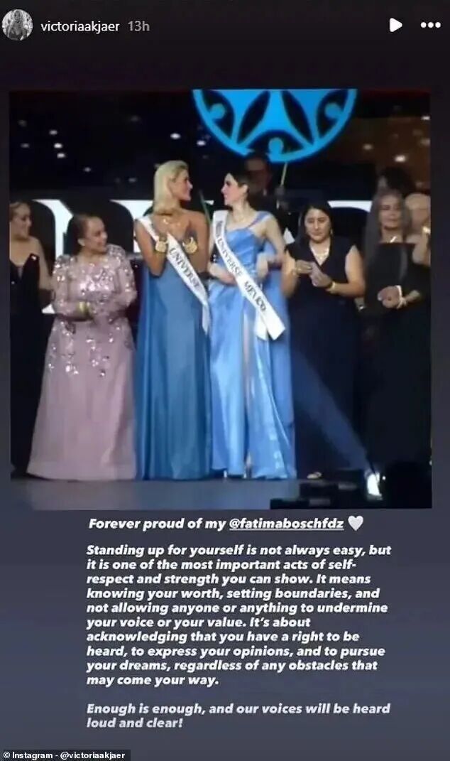 而作为这次集体退赛的先行者,丹麦的卫冕环球小姐维多利亚在社交媒体上晒出了与法蒂玛的合照。