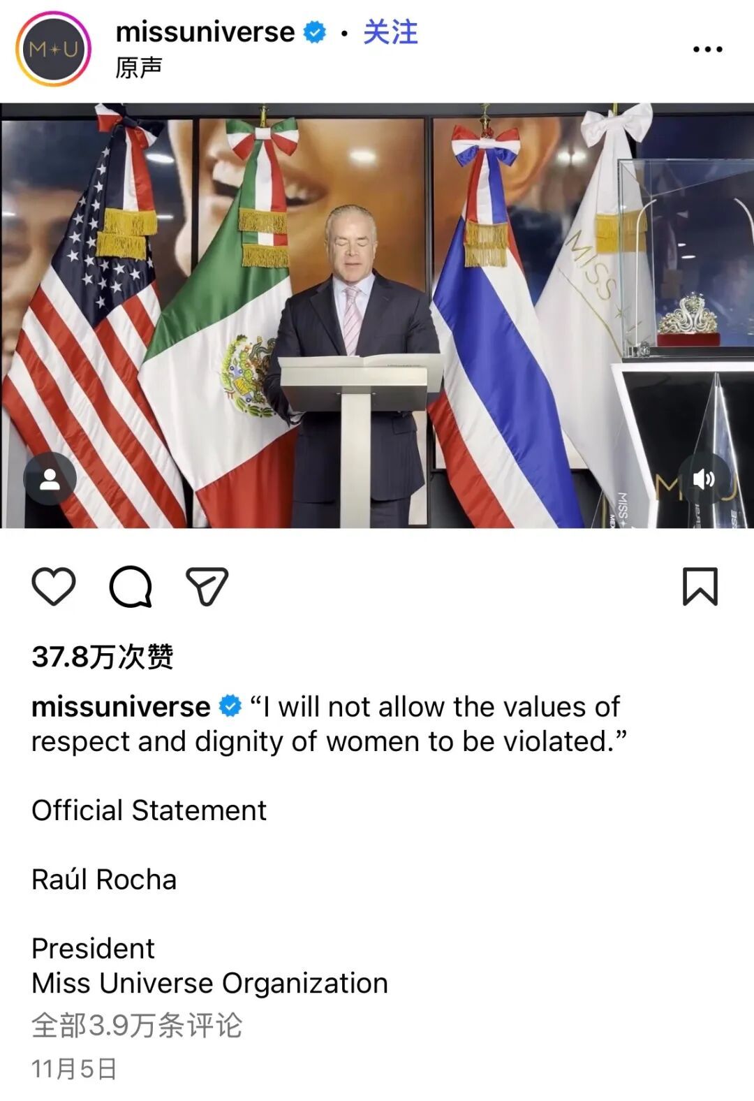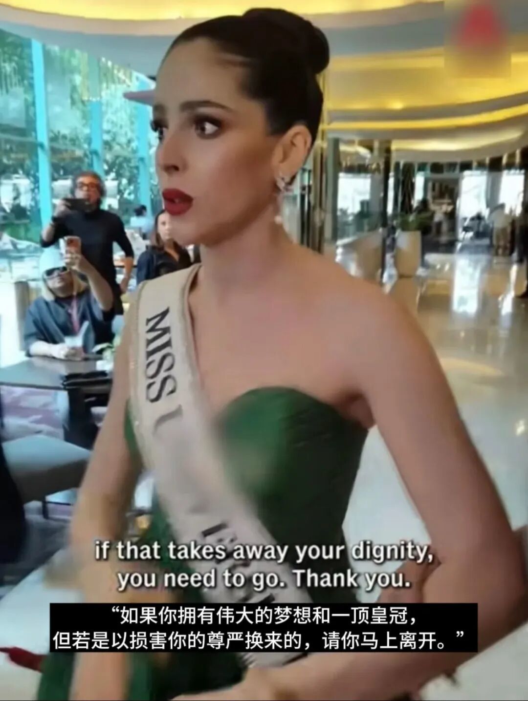 环球小姐组织总裁劳尔·罗查发布了一则视频声明,表示不会允许“尊重女性和女性尊严的价值观受到侵犯”。