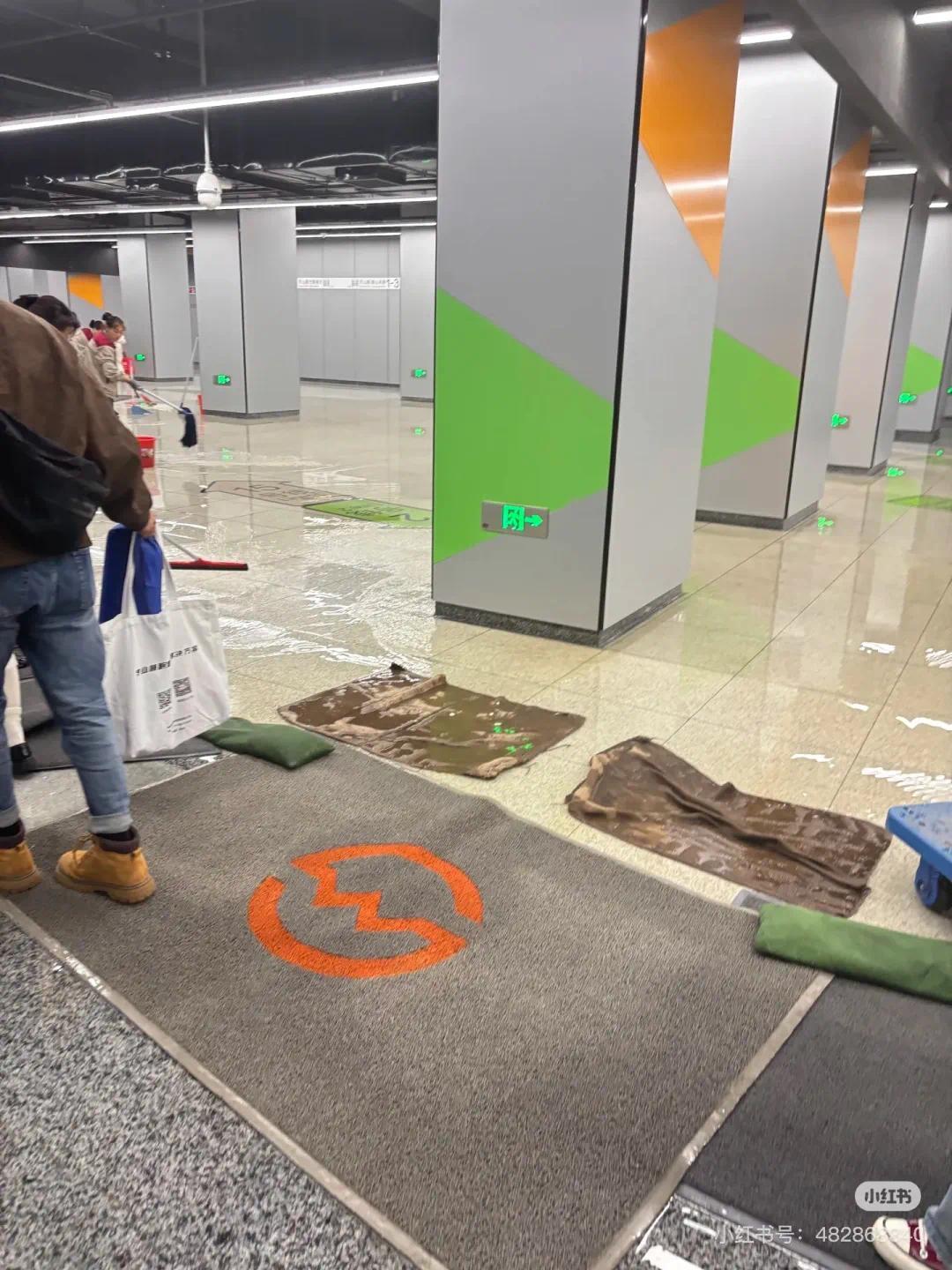 事发后,车站第一时间联系商场处置,阻断溢水源,并立即启动清理工作,及时铺设阻水带,防止积水蔓延,同时安排工作人员疏导客流,确保现场秩序。
