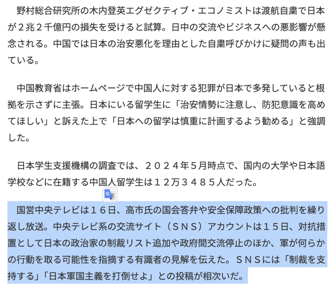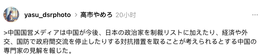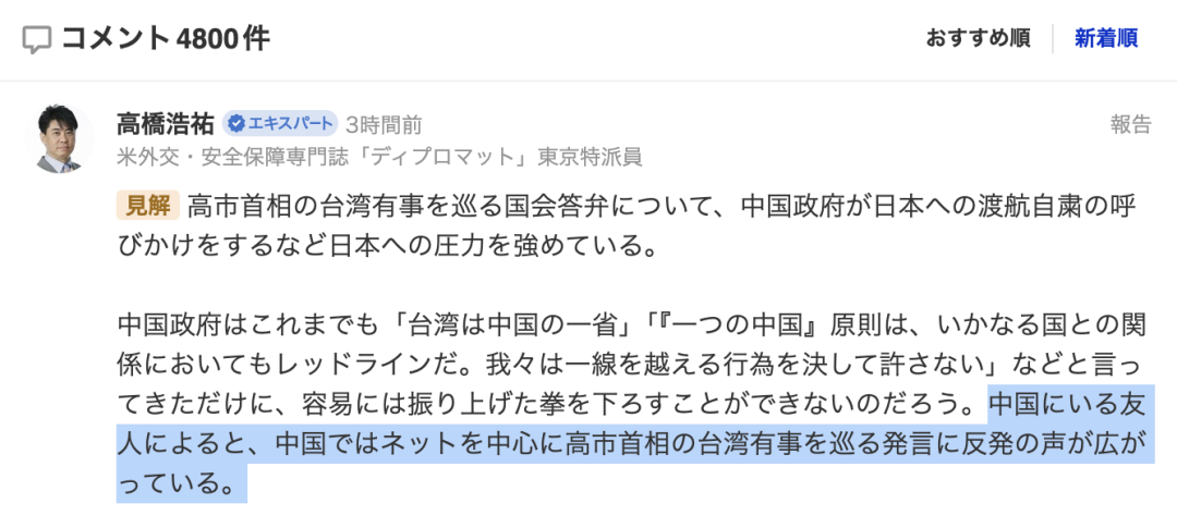 《外交官》(The Diplomat)驻东京记者在一条讨论量热度颇高的文章中同样提到,中国国内正以网络为中心,针对高市首相有关台湾事态的言论掀起强烈反响。这一观察引发日本网友的持续关注与讨论。