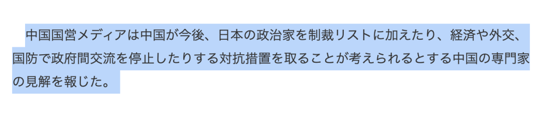 在转引玉渊谭天文章时,日本第一大通讯社共同社特别提炼出核心信号——中国已经做好对日实质性反制的准备。报道提及,反制可能包括将相关日本政界人士列入制裁名单,暂停中日两国在经济、外交和国防领域的政府间交流。