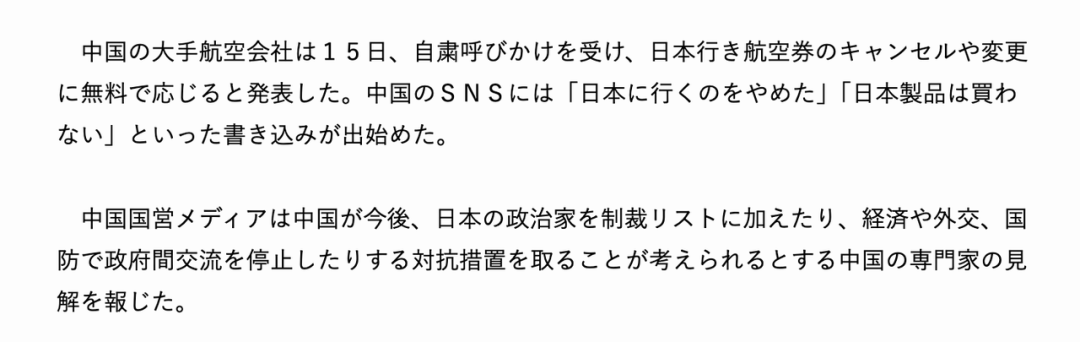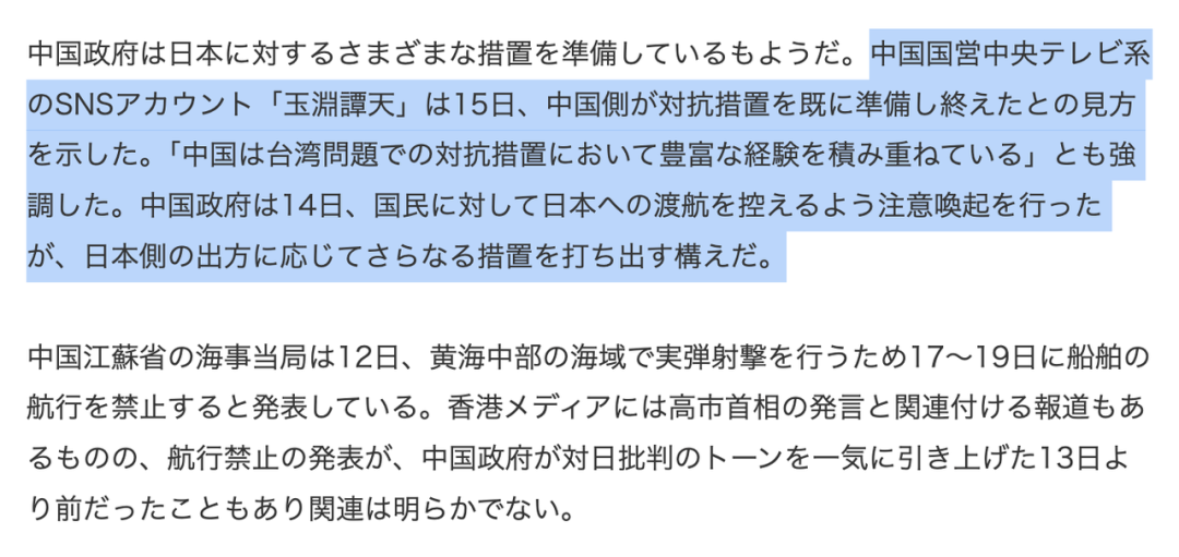 在玉渊谭天报道发布后,日本地方媒体也密集跟进。《东京新闻》《京都新闻》《冲绳时报》《琉球新报》《南日本新闻》《山阳新闻》等各地媒体不断表示,中国做好反制准备,意味着日本的旅游业、教育业等都可能会受到打击。