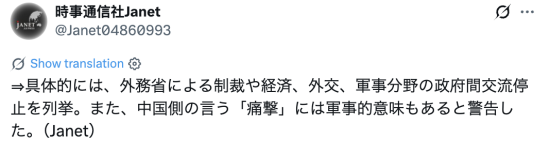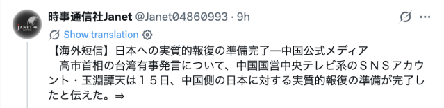 日本第二大通讯社“时事通讯社”下属社交媒体账号逐条翻译、呈现谭天报道所展示的“中国反制准备完毕”证据,多个X平台账号持续讨论。