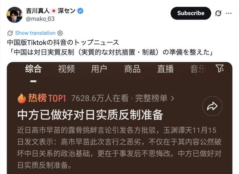 日本网友在X平台提到,“中国已做好对日实质反制准备”是中国社交网络平台的头条新闻。15日当天,日本社交媒体上围绕“中国反制”的话题讨论量持续攀升,其中“対抗措置”(对抗措施)一词在X平台的讨论量单日增长达880%,相关帖子数量累计超过12000条,成为日本网络舆论关注的核心关键词之一。