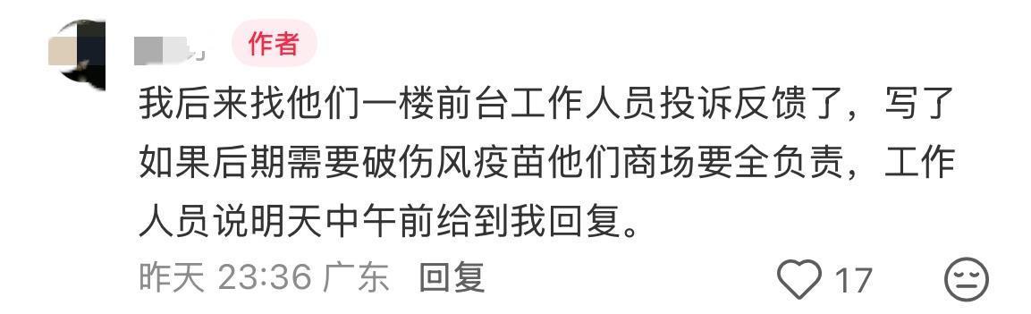 该网友在评论区中留言表示,事发当天晚上,其已前往商场一楼前台进行投诉反馈,除了告知工作人员厕所铁片划伤自己的情况,还明确提出“若后期需要注射破伤风疫苗,相关费用需由商场承担”的诉求,工作人员表示会在11月17日对此事作出正式答复。