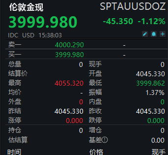 【大河财立方消息】11月18日,现货金价持续下跌。截至发稿,伦敦金现日内跌幅1.12%,报3999.98美元/盎司,失守4000美元/盎司关口。
