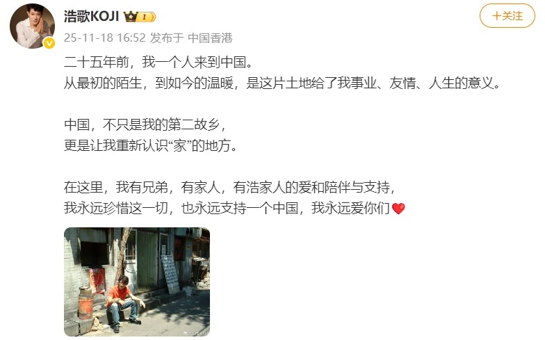 矢野浩二表示:“二十五年前,我一个人来到中国。从最初的陌生,到如今的温暖,是这片土地给了我事业、友情、人生的意义。中国,不只是我的第二故乡,更是让我重新认识‘家’的地方。在这里,我有兄弟,有家人,有浩家人的爱和陪伴与支持,我永远珍惜这一切,也永远支持一个中国,我永远爱你们!”