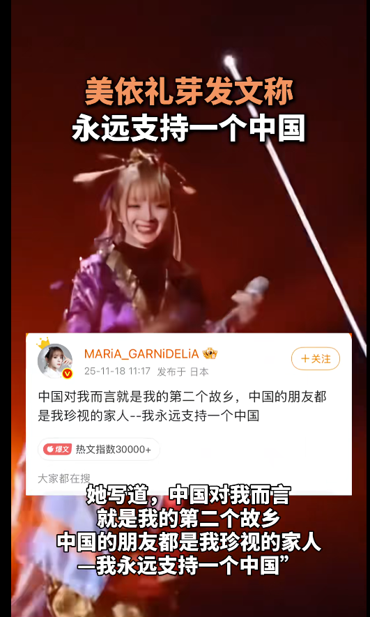 美依礼芽说:“中国对我而言就是我的第二个故乡,中国的朋友都是我珍视的家人——我永远支持一个中国。”