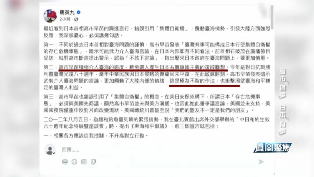 高市早苗的涉华言论也引发了台湾社会的不满与批判。11月15日,中国国民党前主席马英九发文表示,高市早苗介入台海的态度,难免让人产生日本右翼军国主义复辟的联想。这是极为不智的做法,冲击渴望台海和平稳定的台湾民众利益。岛内媒体人林公正以《日挑唆两岸关系 台湾勿上当》为题投书台湾《联合报》表示,高市早苗“假设”大陆会用各种手段“夺取”台湾,制造台湾人心浮动与对大陆的敌意,然后再“牵拖”大陆对台动武会危及日本存亡,这种唯恐台海不乱的用心,正是日本政客的典型嘴脸。