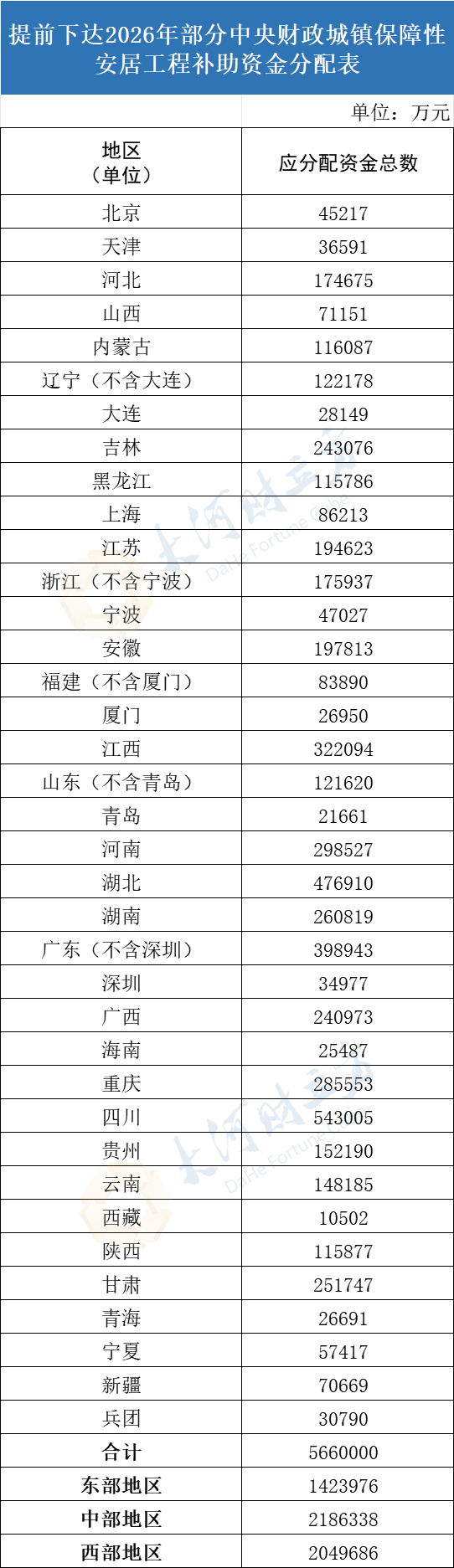 【大河财立方消息】 11月19日,财政部发布关于提前下达2026年部分中央财政城镇保障性安居工程补助资金预算的通知。本次共提前下达566亿元补助资金,其中河南省获29.85亿元。