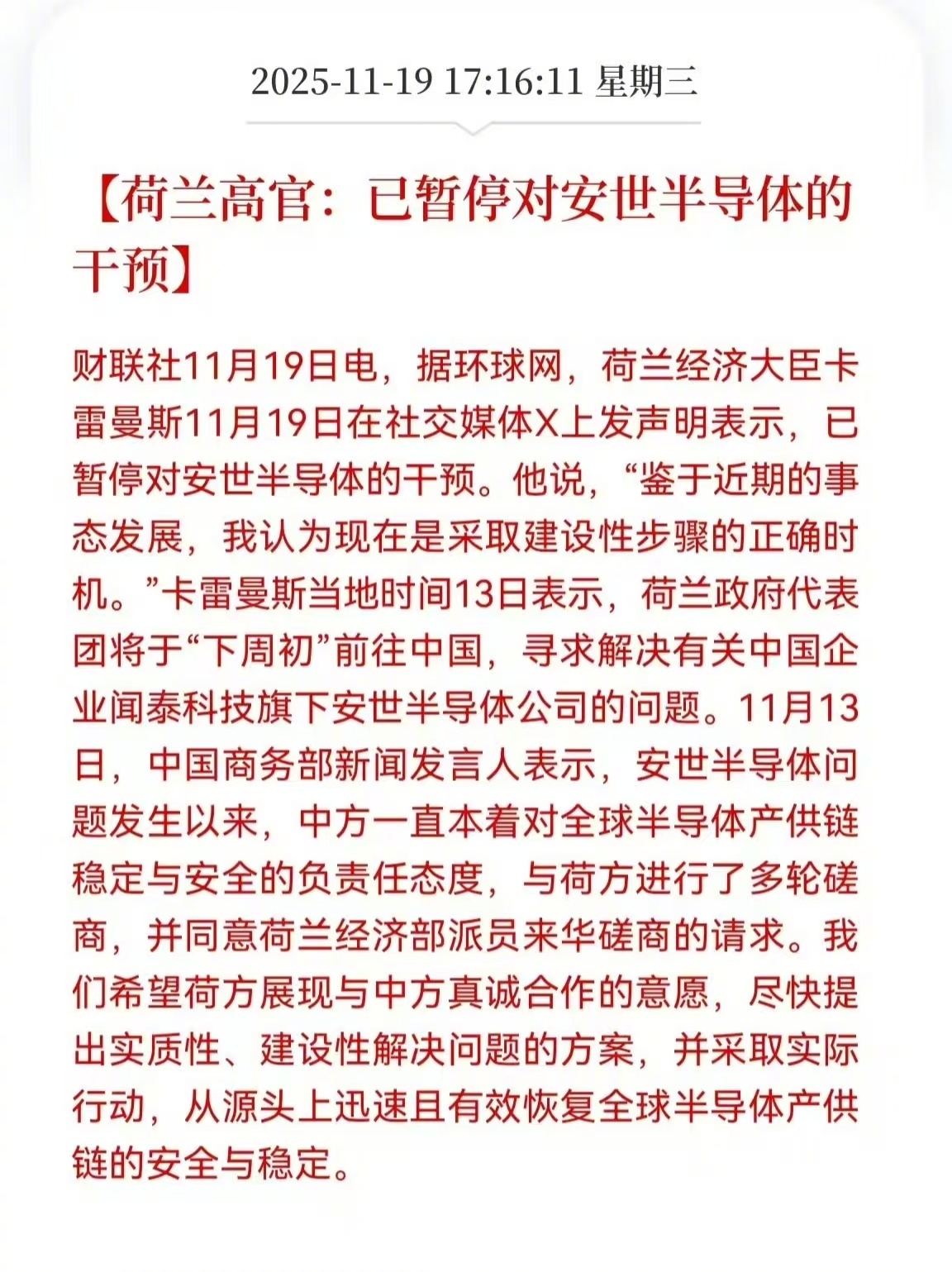荷兰高官宣布,已暂停对安世半导体的干预。中国尊重他国,同时也没那么好惹。我们能击退美国的嚣张贸易攻击,其他方向更有能力捍卫自己的正当权益。西方小国都需自重,对挑衅中国的冲动三思。