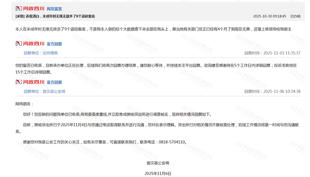 近日,四川达州一名男子在网上反映,称自己在未成年时无缘无故多了9个盗窃案底。“不是我本人做的,可大数据查下来全部算在我头上。”该男子称,跟当地有关部门反映了4个月了无果。