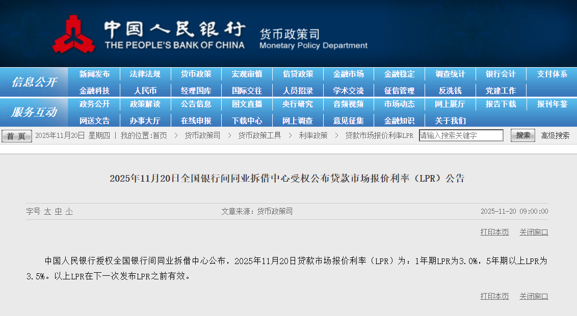【大河财立方消息】 11月20日,11月贷款市场报价利率(LPR)报价出炉:5年期以上LPR为3.5%,上月为3.5%。1年期LPR为3%,上月为3%。