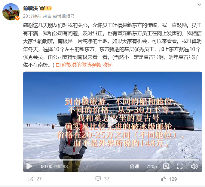 随后,俞敏洪又在社交平台连发10条南极游视频,在网上引发持续关注。11月18日晚,俞敏洪在社交平台发布视频疑似回应争议,他在视频中称:“这次应奚老师邀请来南极,在深刻感受大自然壮美的同时,也一起探讨了未来中国孩子自然教育的前景。新东方将会成立专门的青少年探索中心,带领孩子们探索大自然,用科学的方式让孩子们理解大自然、爱上大自然、保护大自然!专门针对青少年的南极考察之旅也有望在明年冬天开启。”