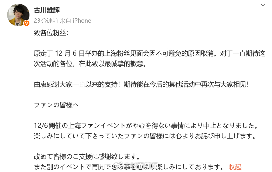 11月20日,日本演员古川雄辉发文称,原定于 12 月 6 日举办的上海粉丝见面会因不可避免的原因取消。对于一直期待这次活动的各位,在此致以最诚挚的歉意。