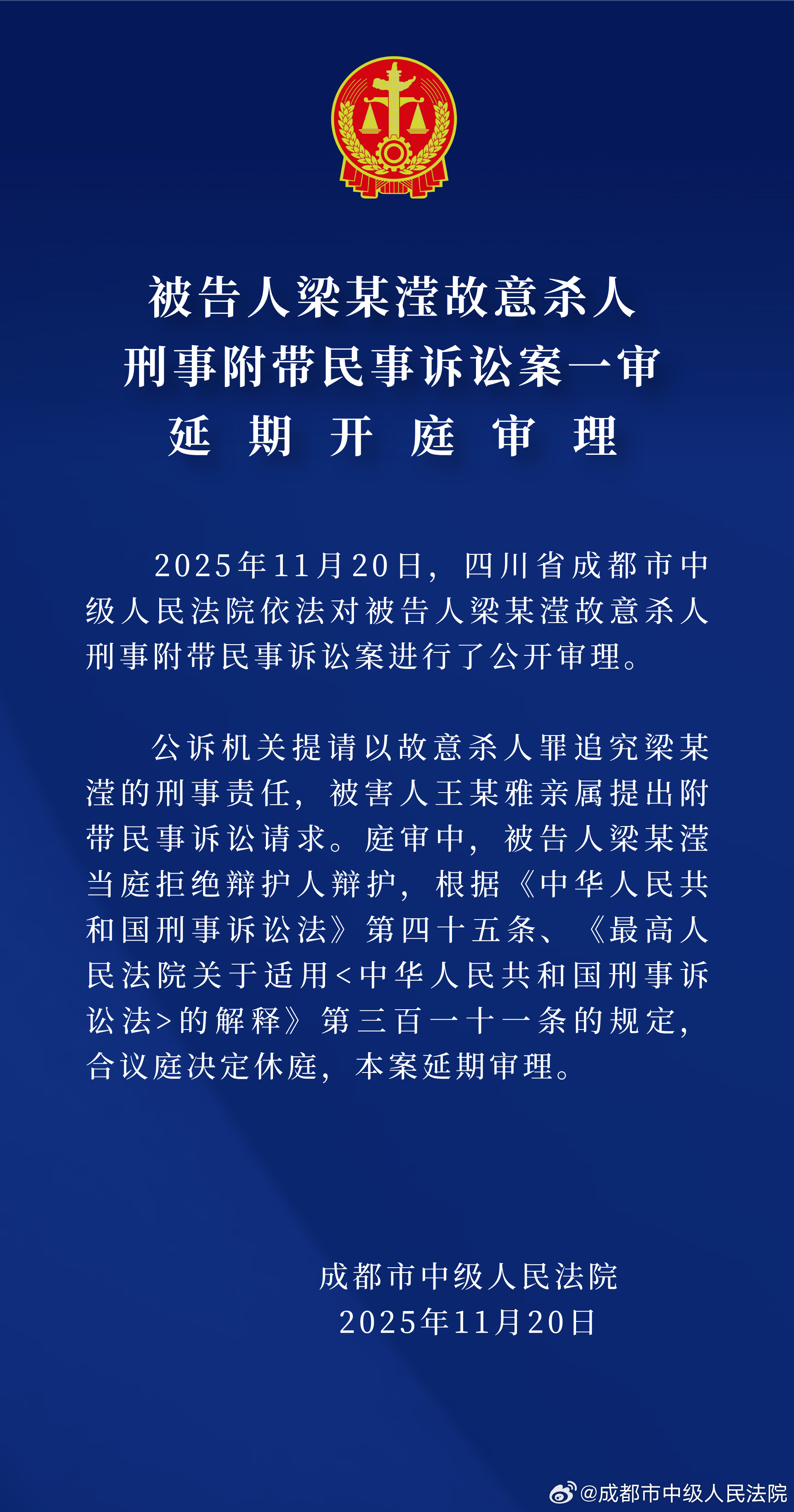 被告人梁某滢故意杀人刑事附带民事诉讼案一审延期开庭审理