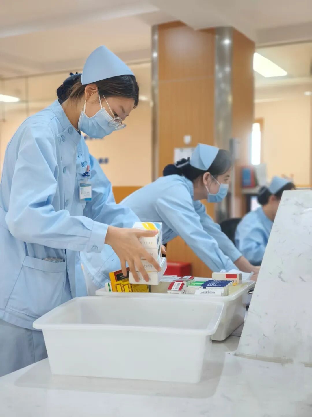 护士们仔细核对床号、姓名、药物信息