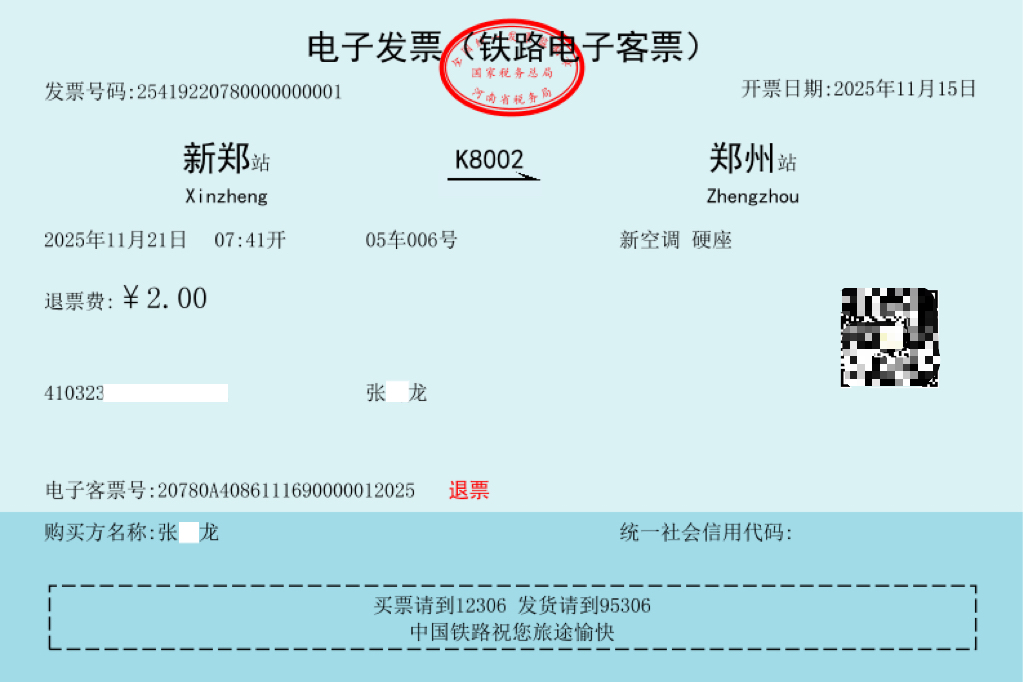 来自洛阳的张雪龙向记者展示了一张他开出的由新郑站到郑州站的001号电子发票。“我本身也是一位火车票收藏爱好者,手里收藏了很多张当年新郑站的车票,今天也非常幸运抢到了新郑站的001号发票,希望未来有更多的火车站可以重新恢复客运。”他说道。